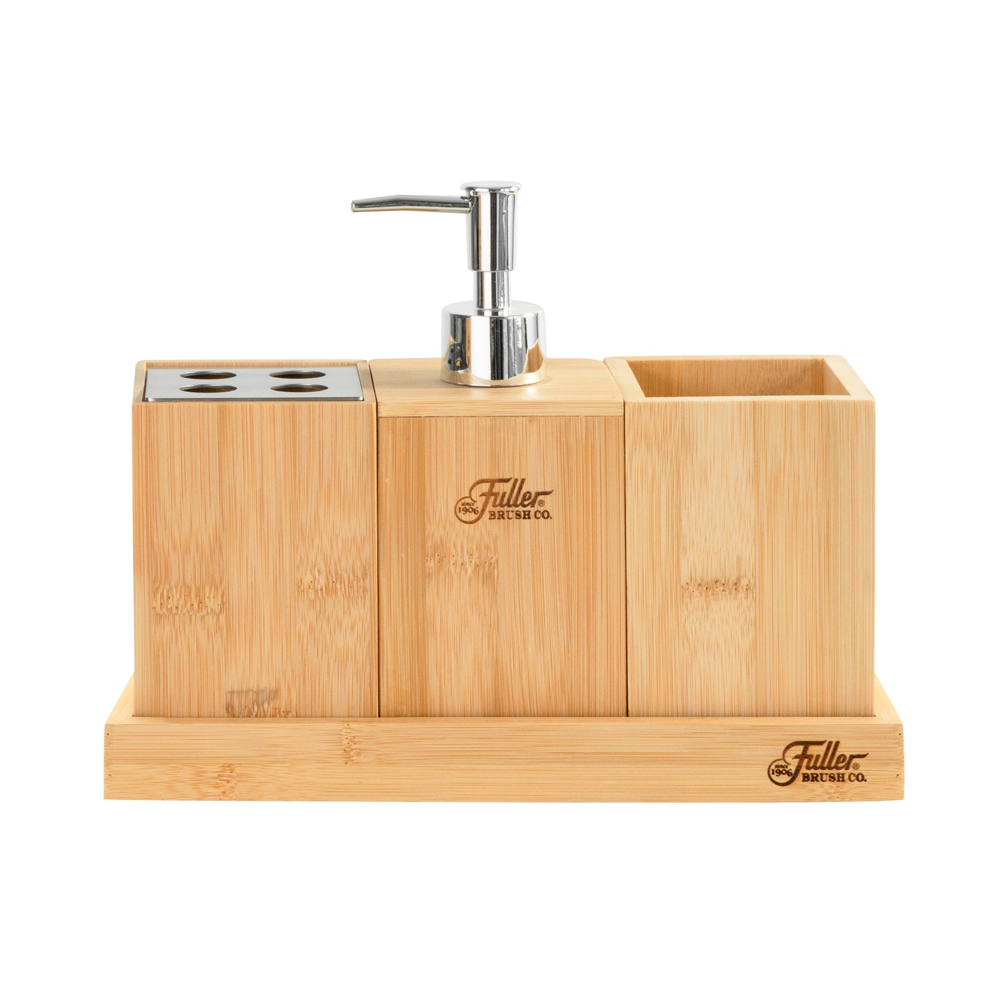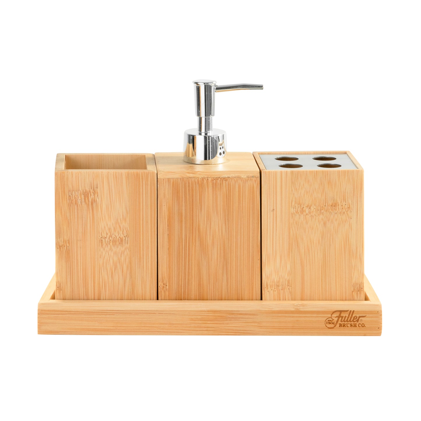 The complete set offers beauty and convenience on the bathroom counter, or the 4 pieces can be separated for use anywhere in your home. The durable and lightweight Dispenser functions as a soap or lotion dispenser. The Toothbrush Holder will organize toothbrushes, makeup brushes, beauty tools and more. The Accessory Holder will accommodate cotton swabs, cotton balls, hair clips, razors, office pens and more. The Vanity Tray offers a place for eyeglasses, watches, jewelry, keys and more. Measures 9-3/4” x 3-3/4” x 7-1/2” tall (including pump.)