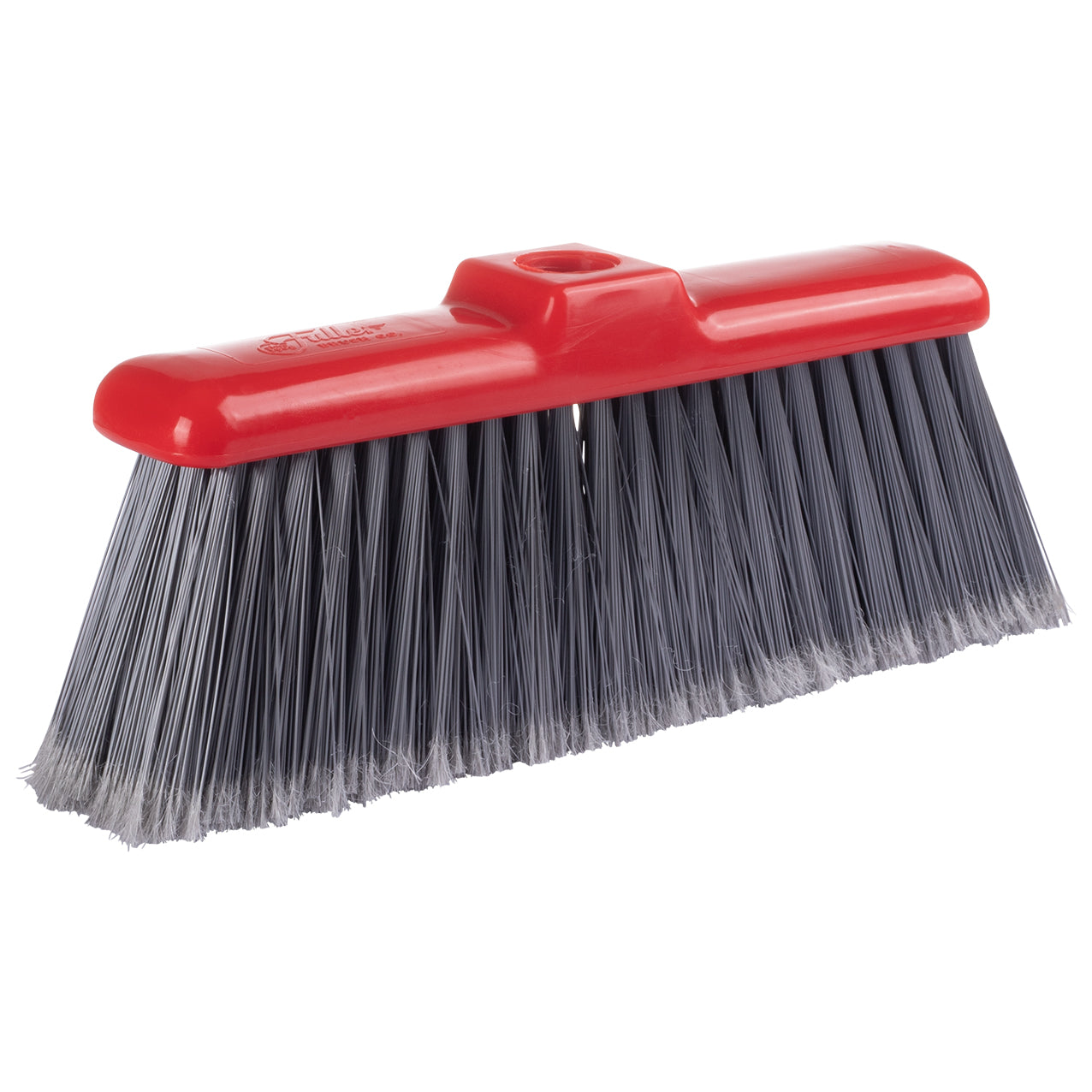 Our lightweight & compact Fiesta Red Kitchen Broom is sure to pick up the finest dust, debris and crumbs from your hard floors. The split-end, flagged, polystyrene bristles insure pickup of fine particles such as sugar, salt, hair, lint and crumbs. Specifically designed with a low profile rectangular head to reach under your kitchen cabinets and along all baseboards. Bristles are 3 inches long. 10 inch sweeping path. Dustpan not included. Made in China