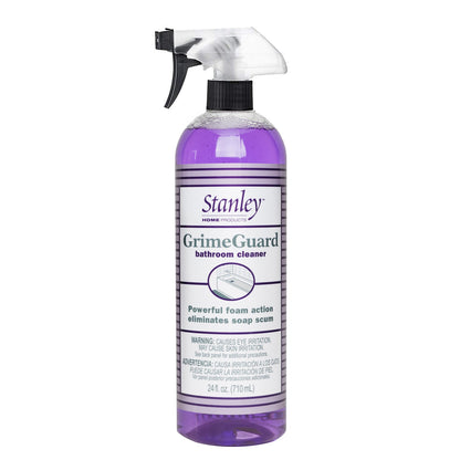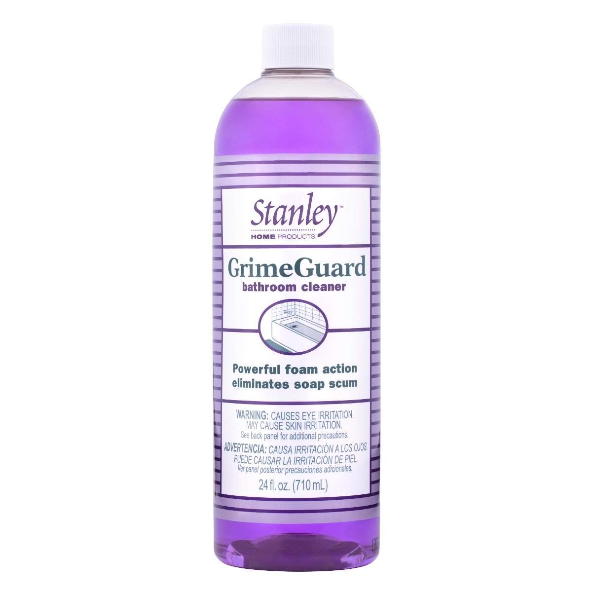 GrimeGuard contains a unique ingredient which produces an invisible shield that keeps surfaces cleaner longer – repels bathroom grime, so soap scum and dirt just wash away – you won’t have to clean as often. Our Stanley Grimeguard dissolves hard water stains caused by calcium, magnesium and other minerals. Grimeguard provides a shield for easy cleanup. Cleans porcelain, fiberglass, ceramic,Formica, enamel and synthetic marble. 24 fl. oz Made in the USA.