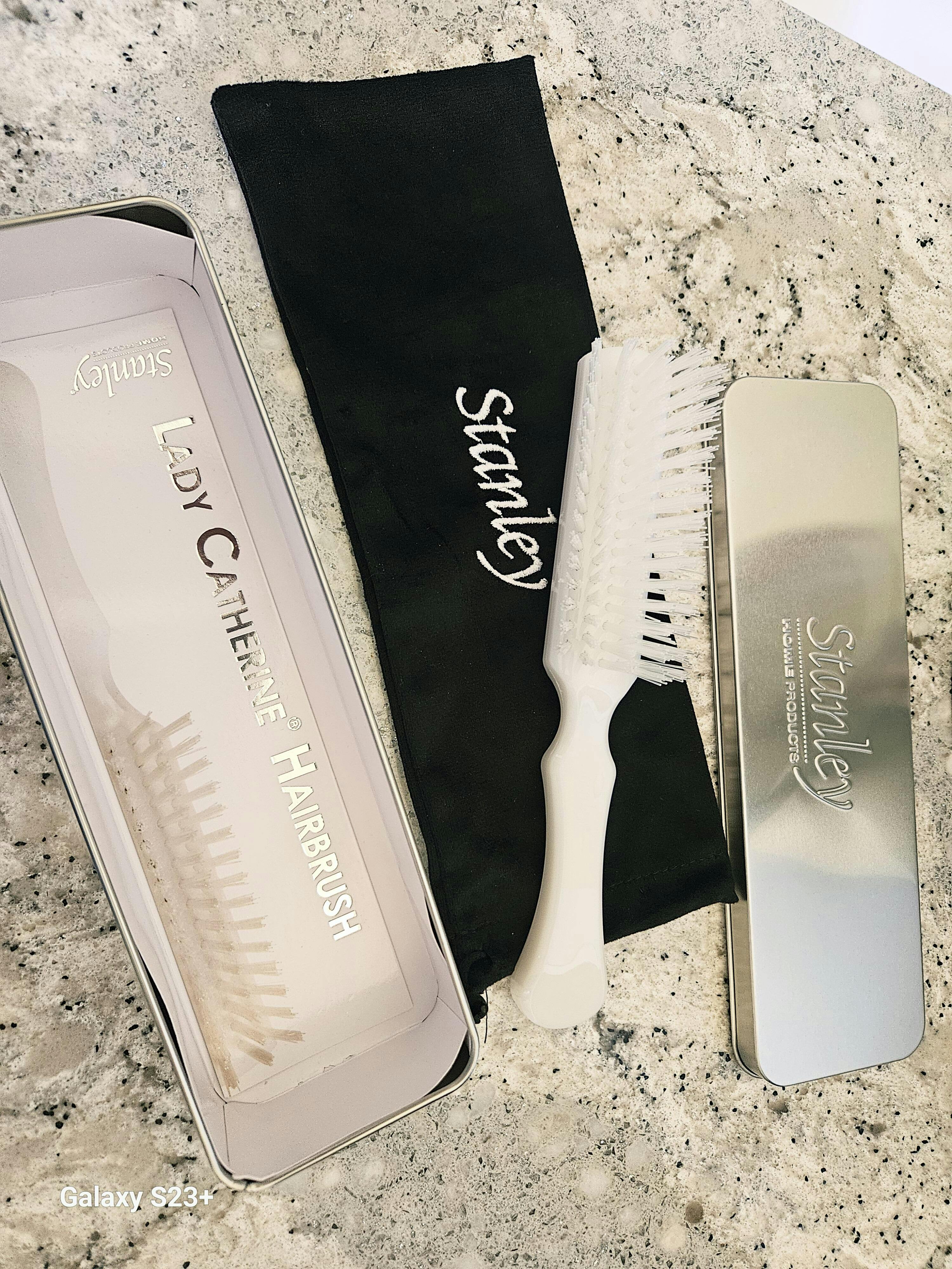 Gift box Special. The Stanley Lady Catherine Hairbrush is a professional firm bristle quality hairbrush for all hair types. You can feel the professional quality of our classic brush as it nestles comfortably in your hand with a contoured handle that is ergonomic and convenient to hold. Made with strong and durable nylon that'll last you a long time. The nylon bristles massage your scalp gently for a soothing experience and our hairbrush is great for long or short hair. The Lady Catherine hairbrush has been loved and coveted for over 46 years by the Fuller fans long known for our superior quality and customer commitment. Comes in limited edition metal case with Stanley logo.