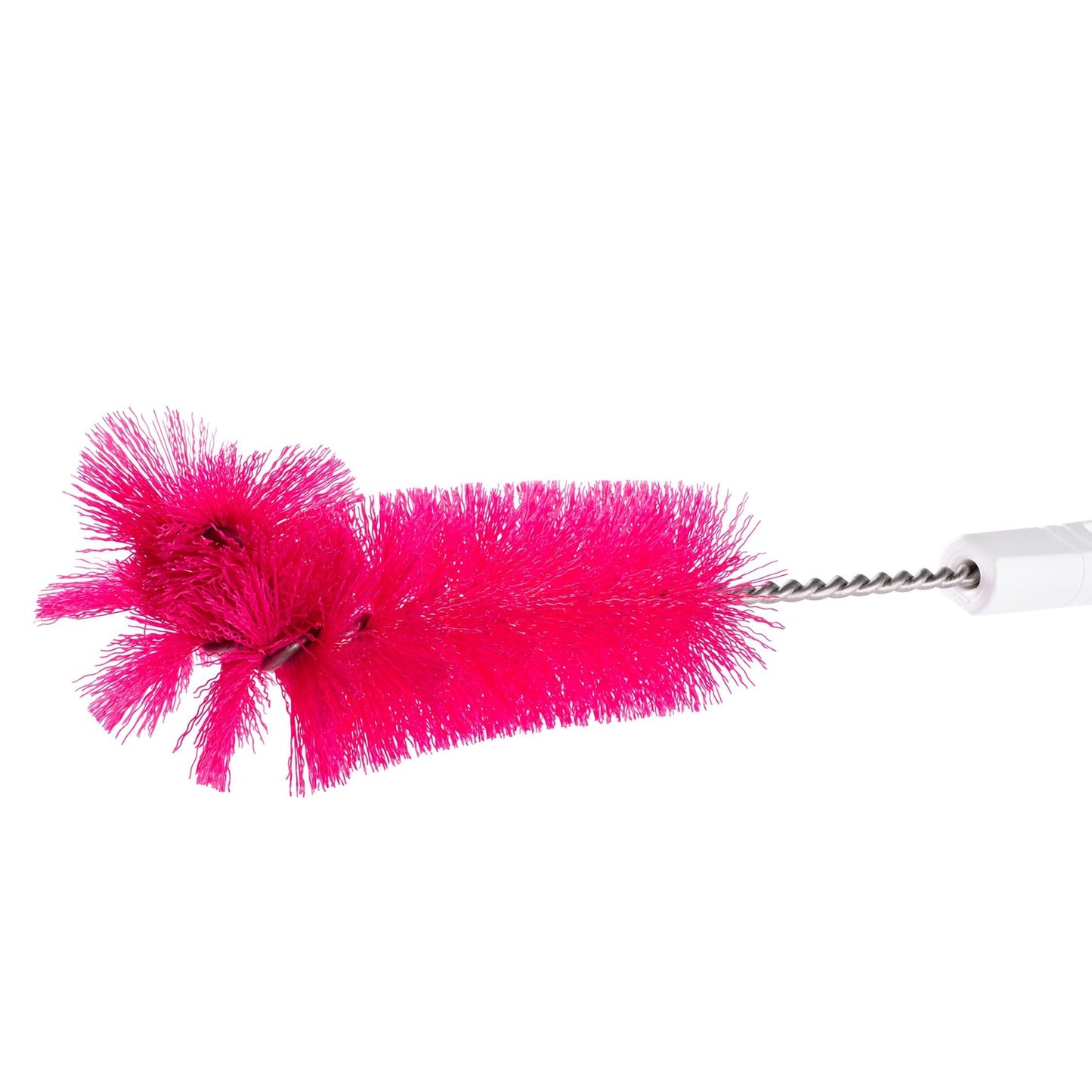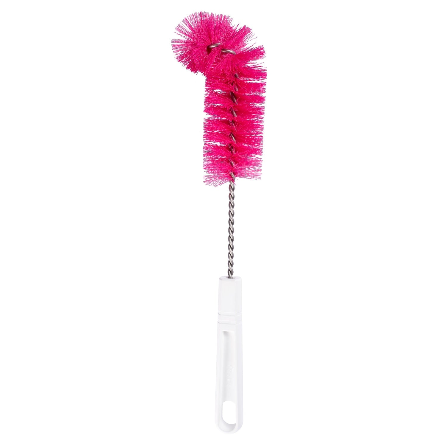 Our Pretty & Pink Sports bottle brush is perfect for cleaning sports and baby bottles. Also can be used for cleaning jars, long wide neck bottles, vases and drinking glasses. Extra durable polyester bristles tackle the tough jobs and bounce back for years of extended use. “Wavy” shape of bristle holds soap and water better than other brushes. Unique twist of wire at the tip provides bristle scrubbing in all directions. Made with sturdy stainless steel wire for rust resistance and extra-long life. Easy to grip plastic handle holds up to repeated use with soap and water. Handle is heat sealed (not glued) to stainless steel wire for extra-long life. Handy hang up hole. Fits in to bottle openings of 1 1/4” diameter or larger. 1 7/8” diameter bristle area. 14” overall length. Dishwasher safe. Will not fit in beer,soda or Snapple type bottles.