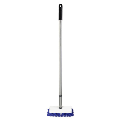 Our tub & shower EZ scrubber easily scrubs tubs and showers without forcing you to bend, stretch, kneel, or hunch. Unique tufting pattern with flared bristles allows scrubbing of all surfaces & corners in the bathtub and shower. Resilient, chemical resistant polyester bristles handle the toughest stains without scratching the surface and bounce back to their original shape. Durable 7 inch x 2-1/2 inch foam block will not chip, crack or rust. Safe to use on fiberglass showers and hot tubs. Includes Adjustable Telescopic Threaded Steel Handle which adjusts to any length from 29" to 52" and has a handy hang-up hole for convenient storage. Scrubber head can be detached from the pole to use by hand for smaller jobs.