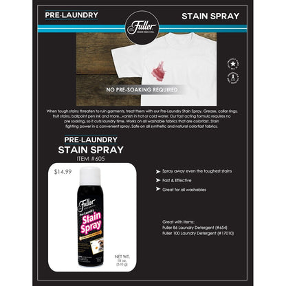 When tough stains threaten to ruin garments, treat them with our Pre-Laundry Stain Spray. Grease, collar rings, fruit stains, ballpoint pen ink and more...vanish in hot or cold water. Our fast acting formula requires no pre soaking, so it cuts laundry time. Works on all washable fabrics that are colorfast. Stain fighting power in a convenient spray. Safe on all synthetic and natural colorfast fabrics. 18 oz spray can. Made in the USA.