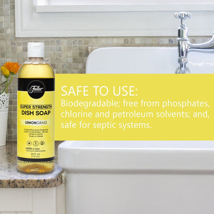With Fuller Brush Super Strength Dish Soap – a few drops or one squirt will go a long way to create long-lasting suds for cutting all kinds of grease such as: olive oil, vegetable oil, butter, meat fats and more. Formulated with the best ingredients for powerful cleaning – yet, gentle on hands for use multiple times per day – with or without dish gloves. Formula is biodegradable, free from phosphates, chlorine and petroleum solvents and safe for septic systems. 24 oz. Made in the USA